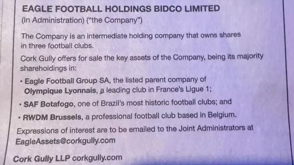 Nomeada como administradora após a inadimplência da holding, a Cork Gully publicou um anúncio no jornal Financial Times informando que pretende negociar participações majoritárias em clubes sob o guarda-chuva da empresa. Entre os ativos listados estão, além do Botafogo, o RWDM Brussels e o Olympique Lyonnais.
