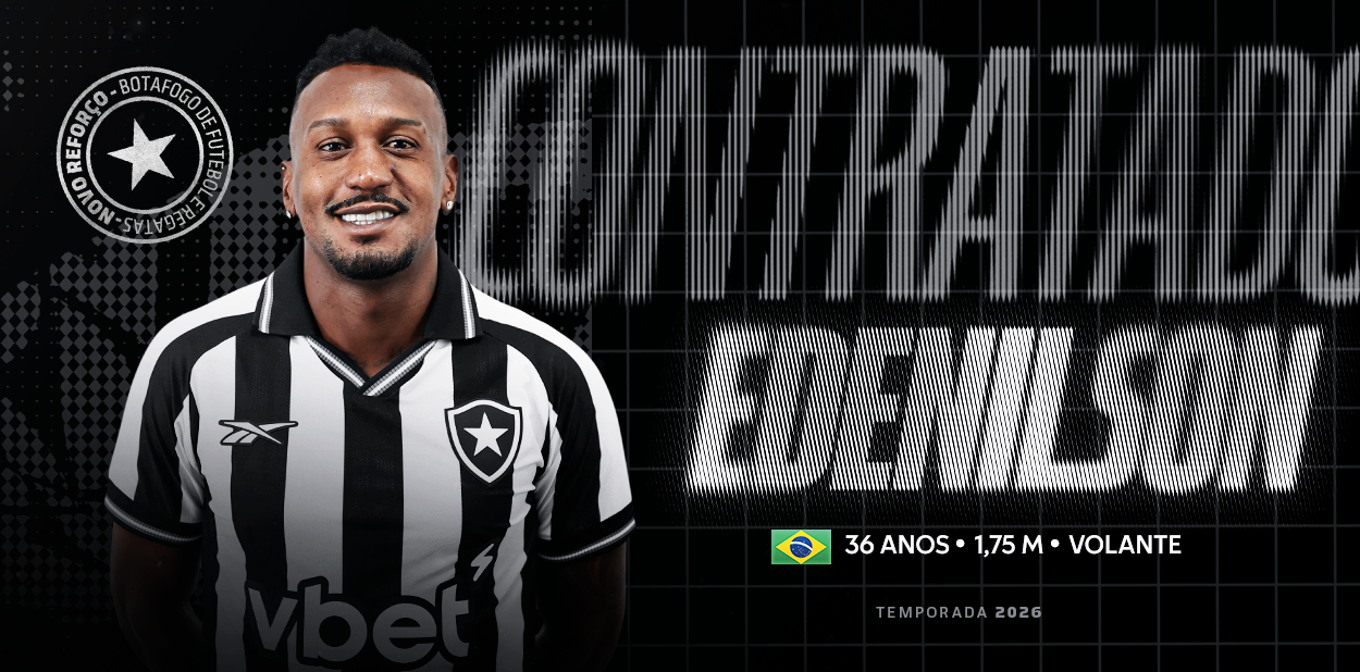 Edenílson, polivalente volante brasileiro, é o mais novo reforço Alvinegro para a temporada de 2026. O atleta, ex-Grêmio (BRA), assinou contrato definitivo até o final de 2026 e já está treinando com seus novos companheiros de equipe. A data da apresentação oficial do Botafogo será em divulgada posteriormente.