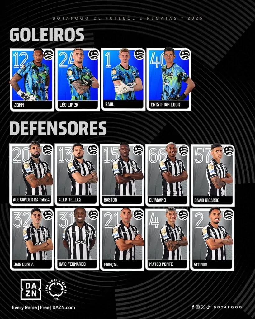 O Botafogo anunciou a relação de 29 atletas convocados para o Super Mundial de Clubes. Incluídos na lista estão Bastos e Matheus Martins, atualmente se recuperando de lesão, além do trio de novos reforços já apresentados: Cristhian Loor, Kaio Pantaleão e Álvaro Montoro.
