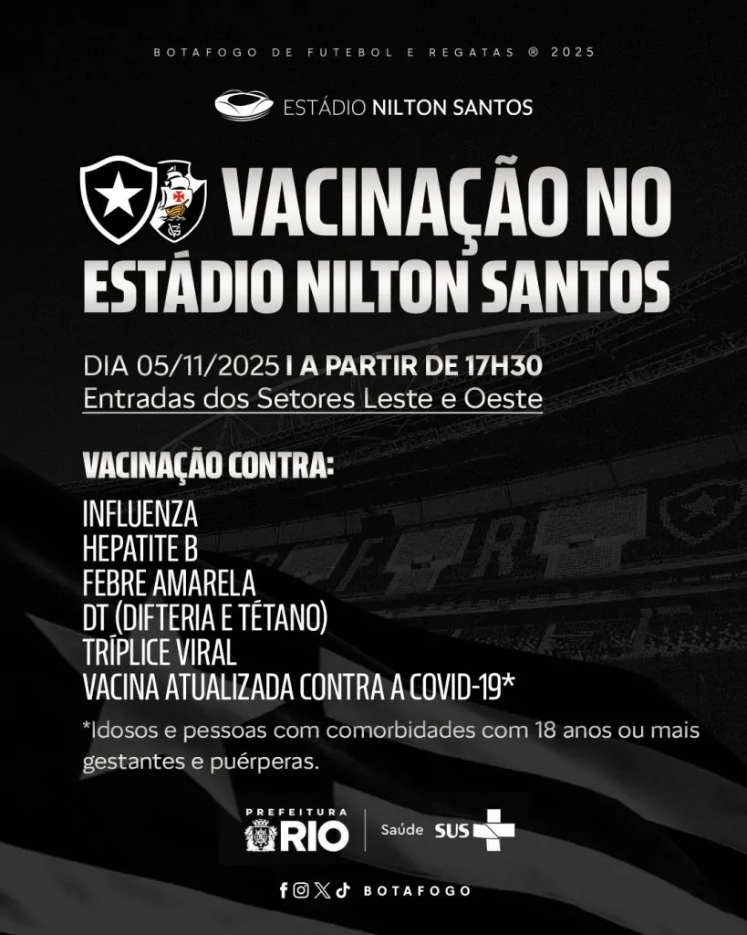 O Botafogo informou que, a partir das 17h30 nesta quarta, 5, torcedores poderão ser vacinados contra Influenza, Hepatite B, Febre Amarela, DT, Tríplice Viral e COVID-19 nas entradas dos setores Leste e Oeste do Estádio Nilton Santos. Fique atento às informações!