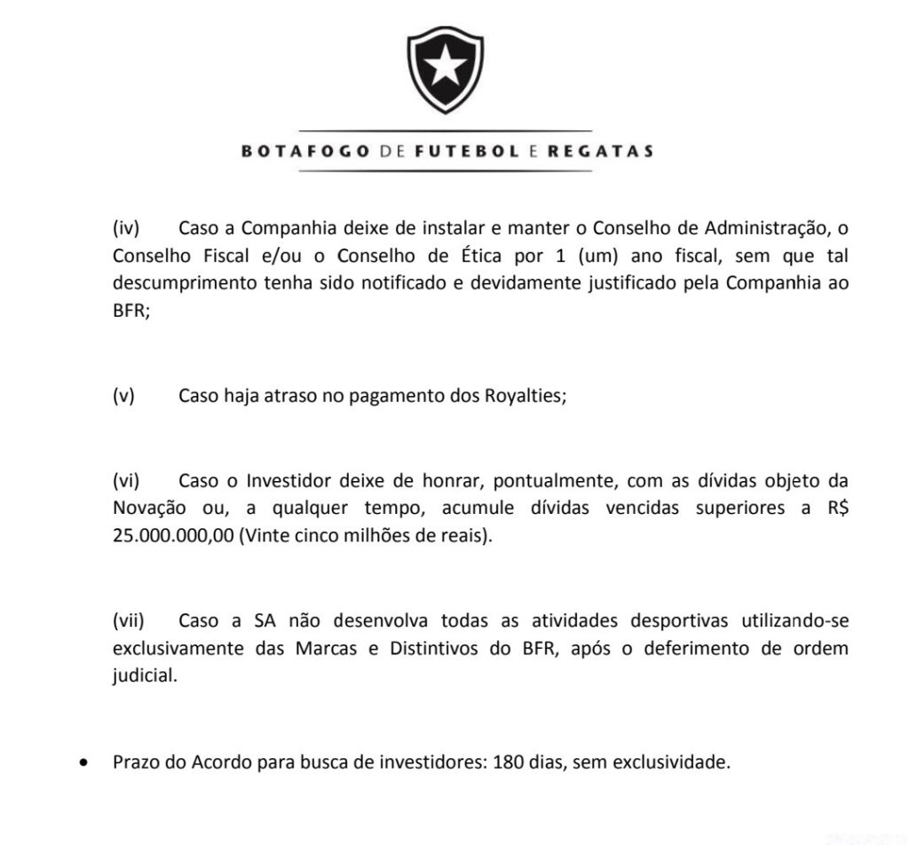 Na prática, de fato, os conselheiros vão dar o aval para que os responsáveis pela captação saiam ao mercado para buscar investidores. O prazo estipulado é de 180 dias sem exclusividade. O atual plano, liderado pelo economista Gustavo Magalhães, prevê aporte de R$ 400 até R$ 550 milhões dos investidores e renegociação de 80% da dívida do Clube.