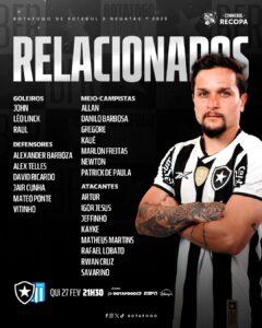 O Botafogo anunciou os jogadores convocados para a grande final da Recopa Sul-Americana contra o Racing nesta quinta-feira, 27, às 21h30, no Estádio Nilton Santos.