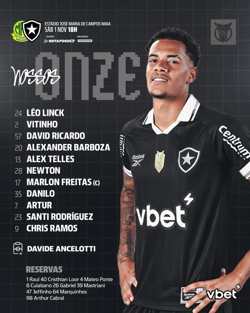 Com David Ricardo de volta à escalação inicial, o Botafogo está confirmado para enfrentar o Mirassol, às 18h (de Brasília), no Maião, pela 31ª rodada do Campeonato Brasileiro.