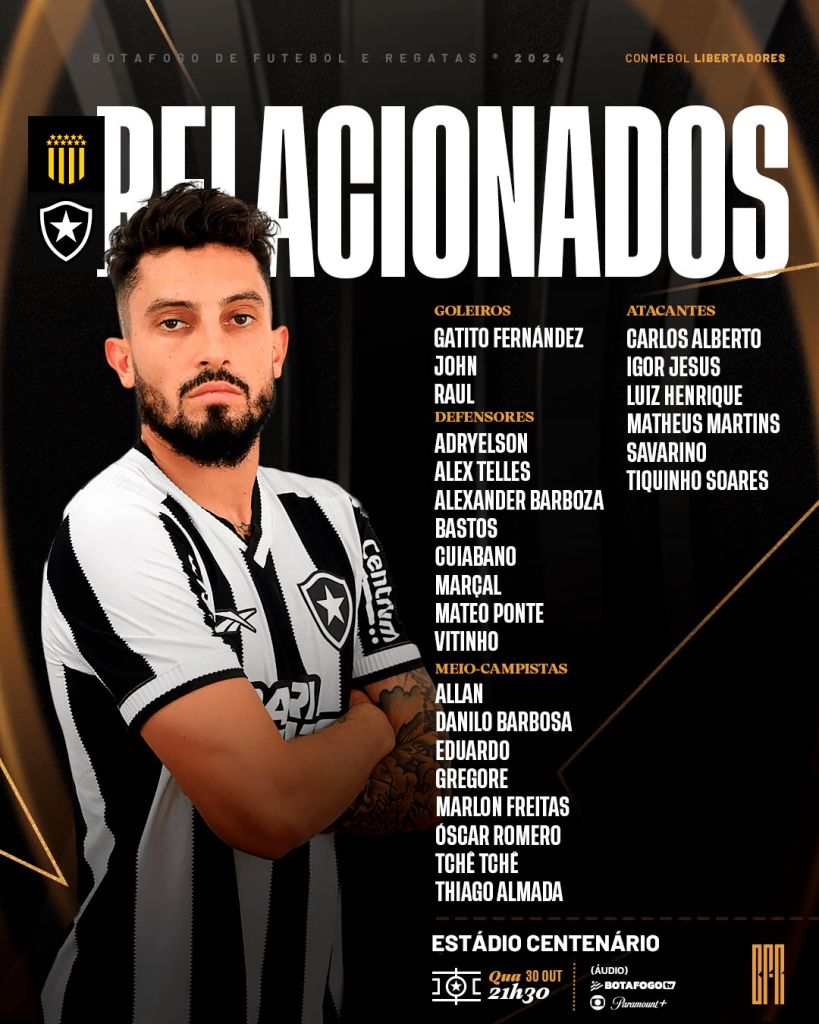 Fogo na Rede > Notícias do Botafogo > Com Gatito e Alex Telles, Botafogo anuncia relacionados para jogo contra o Peñarol