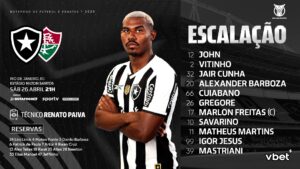 John; Vitinho, Jair, Alexander Barboza e Cuiabano; Gregore e Marlon Freitas; Savarino e Matheus Martins, Igor Jesus e Mastriani.