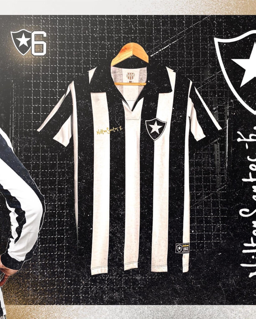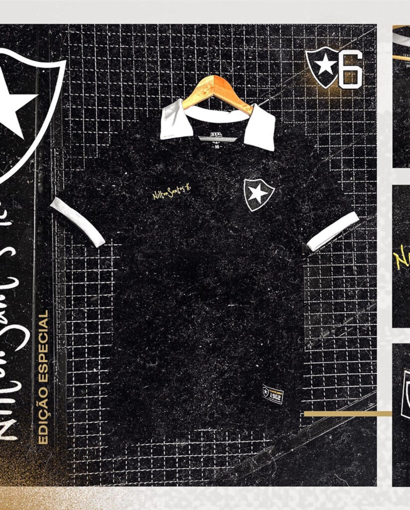 Na semana de aniversário do ídolo Nilton Santos, o Botafogo lançou camisa especial do eterno camisa 6 alvinegro. O modelo – tradicional, preta ou branca – tem opção de manga longa ou curta. As peças custam a partir R$ 159,90. Para garantir o modelo histórico, .