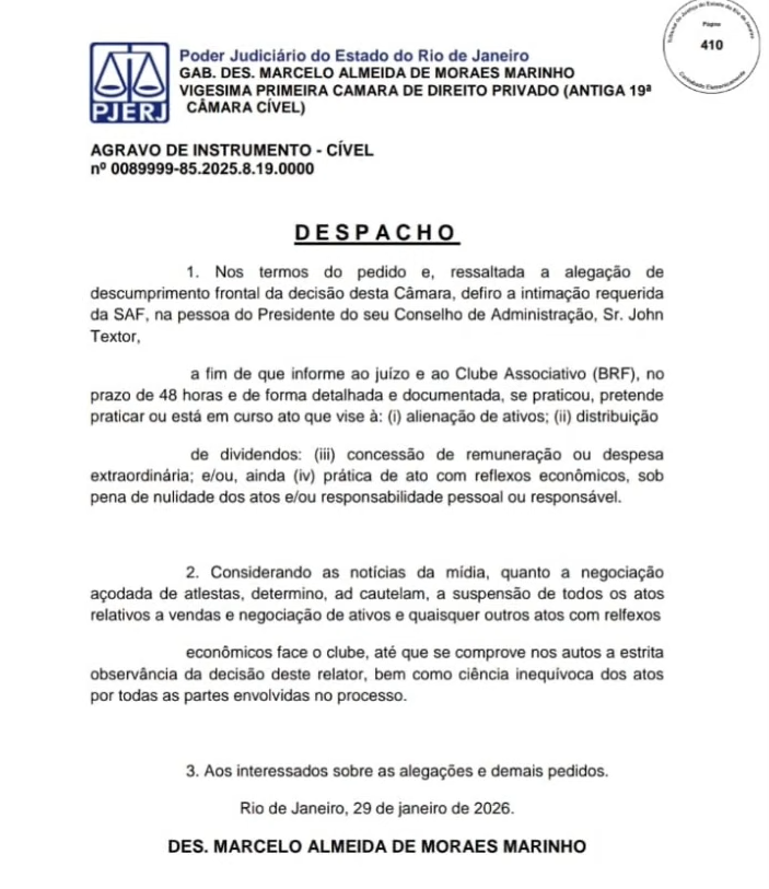 A Justiça concedeu um prazo de 48 horas para que John Textor se manifeste formalmente nos autos. O empresário norte-americano é esperado no Rio de Janeiro ainda nesta quinta-feira e já informou que estará presente no Estádio Nilton Santos para acompanhar a estreia do Botafogo no Campeonato Brasileiro, contra o Cruzeiro.