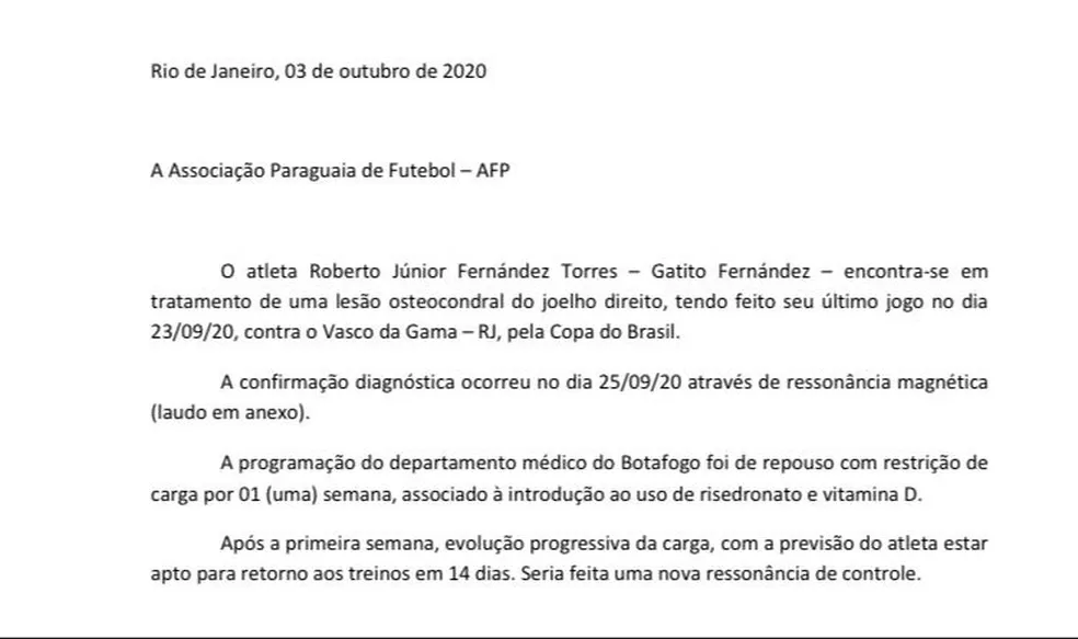 De acordo com documento ao qual a rádio Tupi teve acesso, o departamento médico do Botafogo recomenda repouso do atleta. O material, enviado à Associação Paraguaia de Futebol diz: