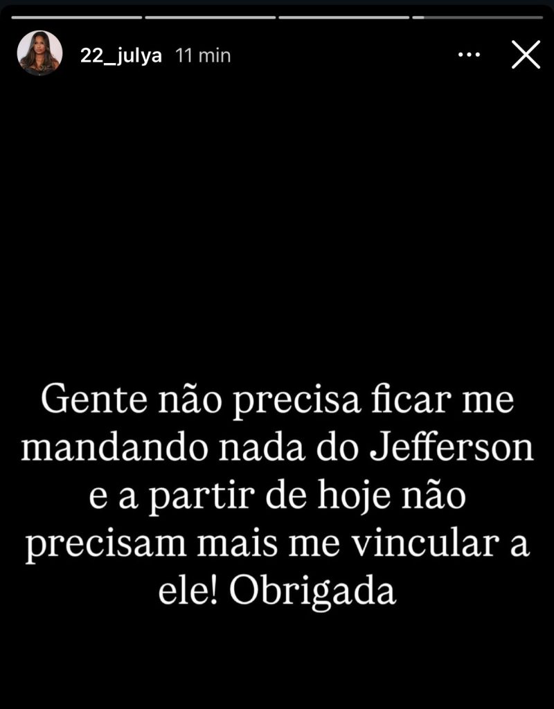 — Gente, não precisa ficar me mandando nada do Jefferson, e a partir de agora não precisam mais me vincular a ele! Obrigada – pediu Julya.