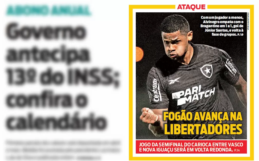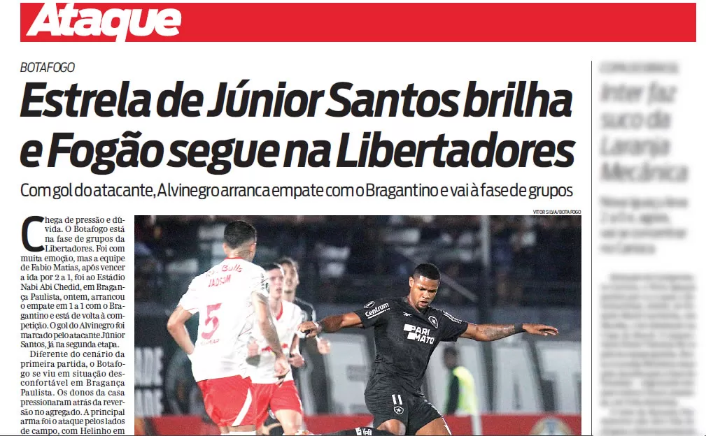 A classificação do Botafogo para a fase de grupos da Libertadores ganhou as capas de jornais do Rio. O Glorioso avançou após empatar com o Red Bull Bragantino, em Bragança Paulista, e encerrar o confronto com o placar agregado de 3 a 2.