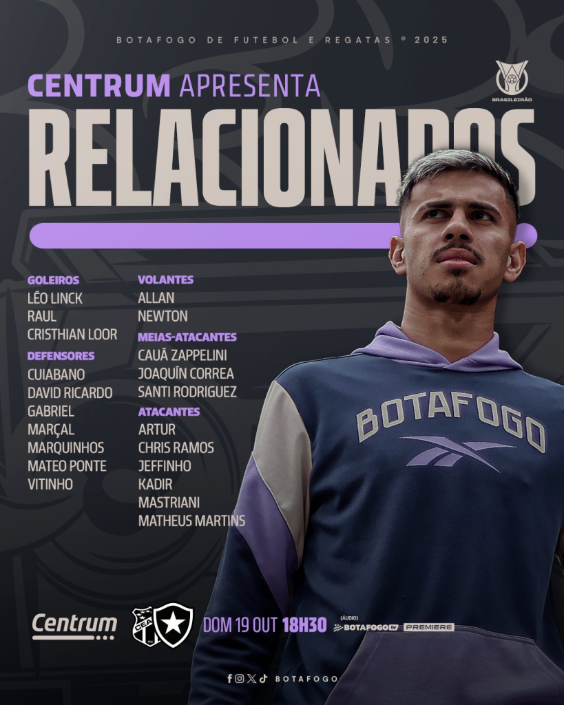 Com novos desfalques, o Botafogo anunciou os relacionados para a partida contra o Ceará, neste domingo, 19, às 18h30 (de Brasília), na Arena Castelão, pela 29ª rodada do Campeonato Brasileiro. Arthur Cabral, Savarino e Nathan Fernandes estão fora do onfronto.